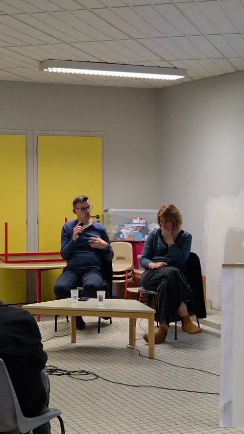 L’animateur a ensuite alterné les questions posées aux invités (Camille Branchereau, adjointe aux solidarités de la Chapelle-sur-Erdre et Geoffroy Verdier, directeur d’ADT44 et co-président des Ecosollies). Certaines étaient préparées à l’avance, d’autres posées par les Lucéens, par post-it et en direct.